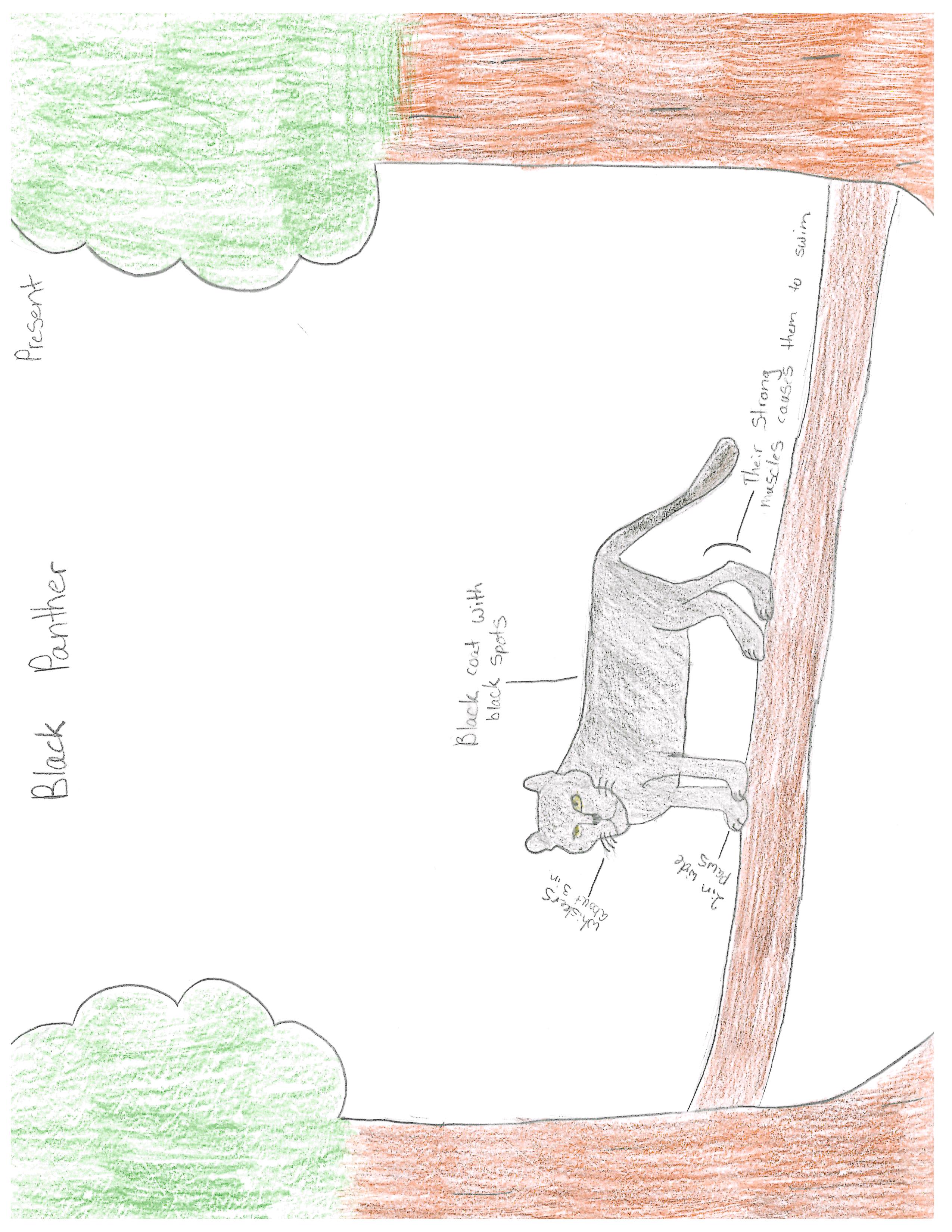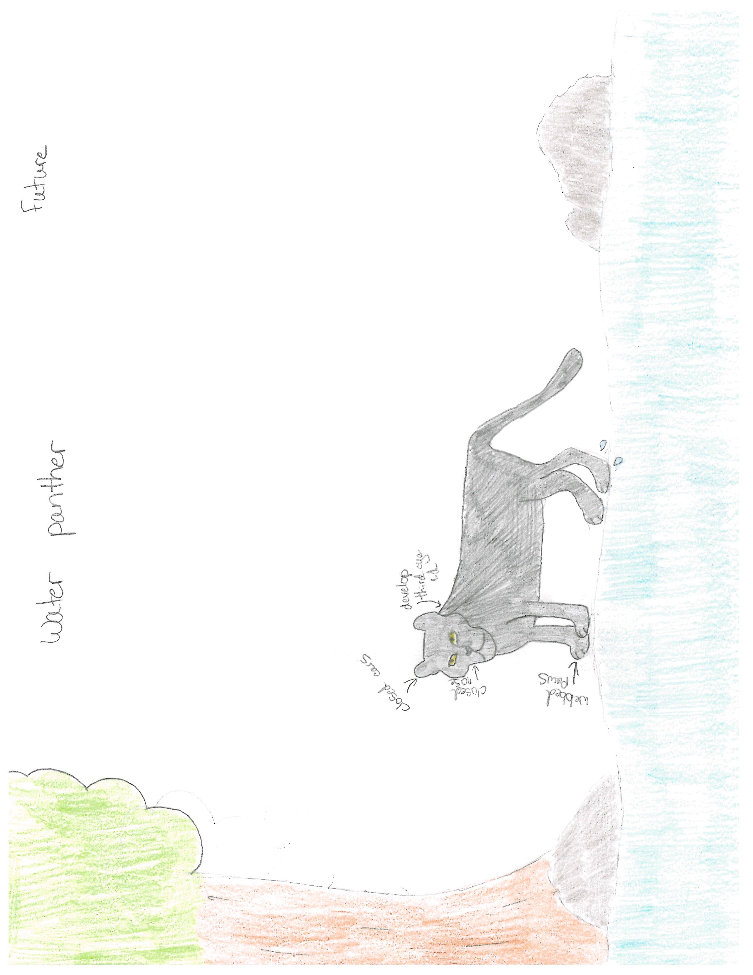 Black Panthers are located in south and southeast Asia and the Amazon Rainforest in Central South America.The issues in the south and southeast are climate change, leading to fires and droughts, and pollution. They have many characteristics, big paws, black coat with black spots, strong body to swim and hunt, also their behavioral can solitary, stealthy, and their very good natural hunters. In the future the Black Panther turns into the Water Panther due to glaciers melting. Meanwhile their body will start changing from the environment change. Including they might get webbed paws for being able to swim better, closed ears and nostrils so water doesn’t get in their eyes or nose, and develop a third eye lid so water won’t get in their eyes.