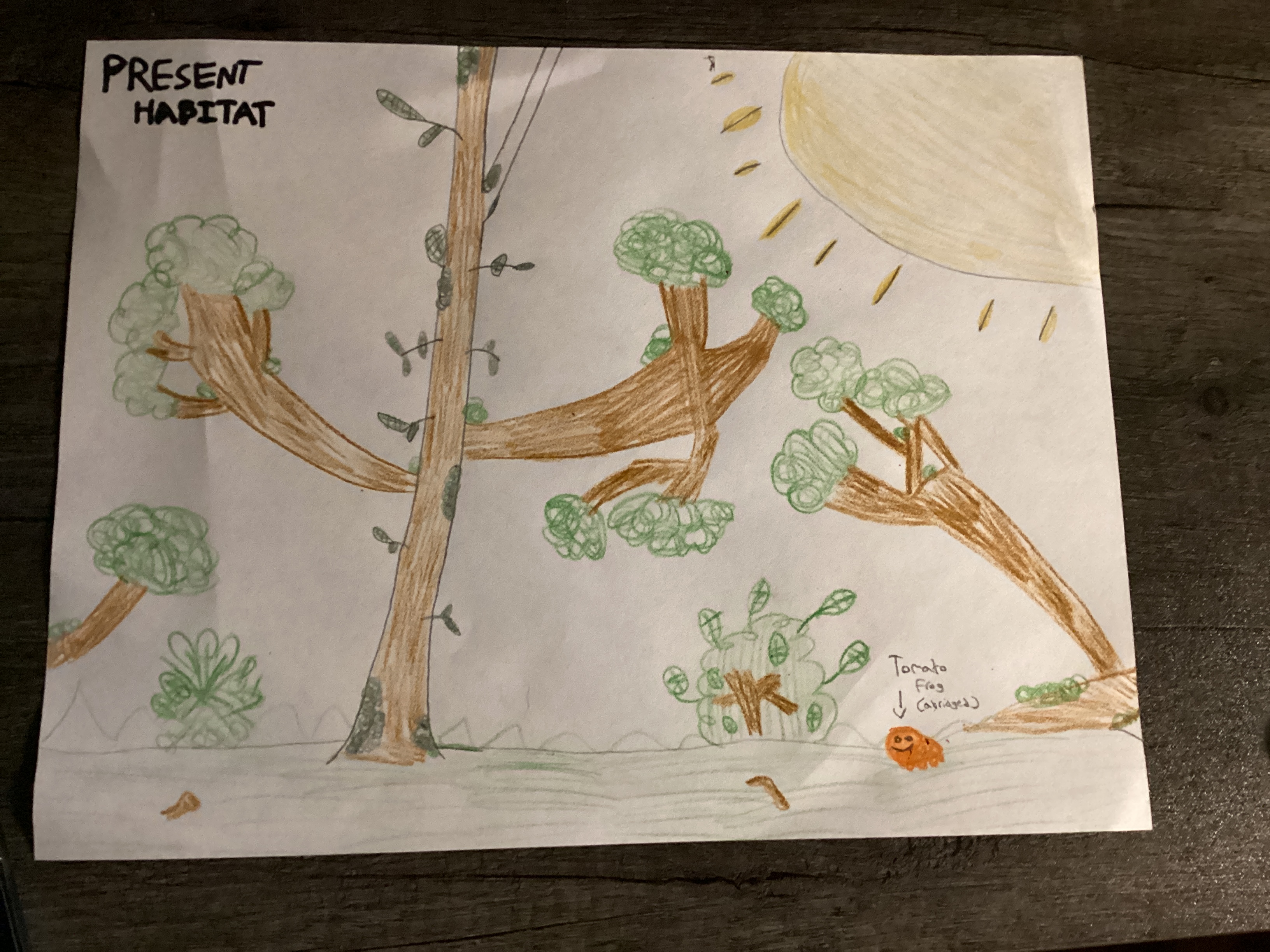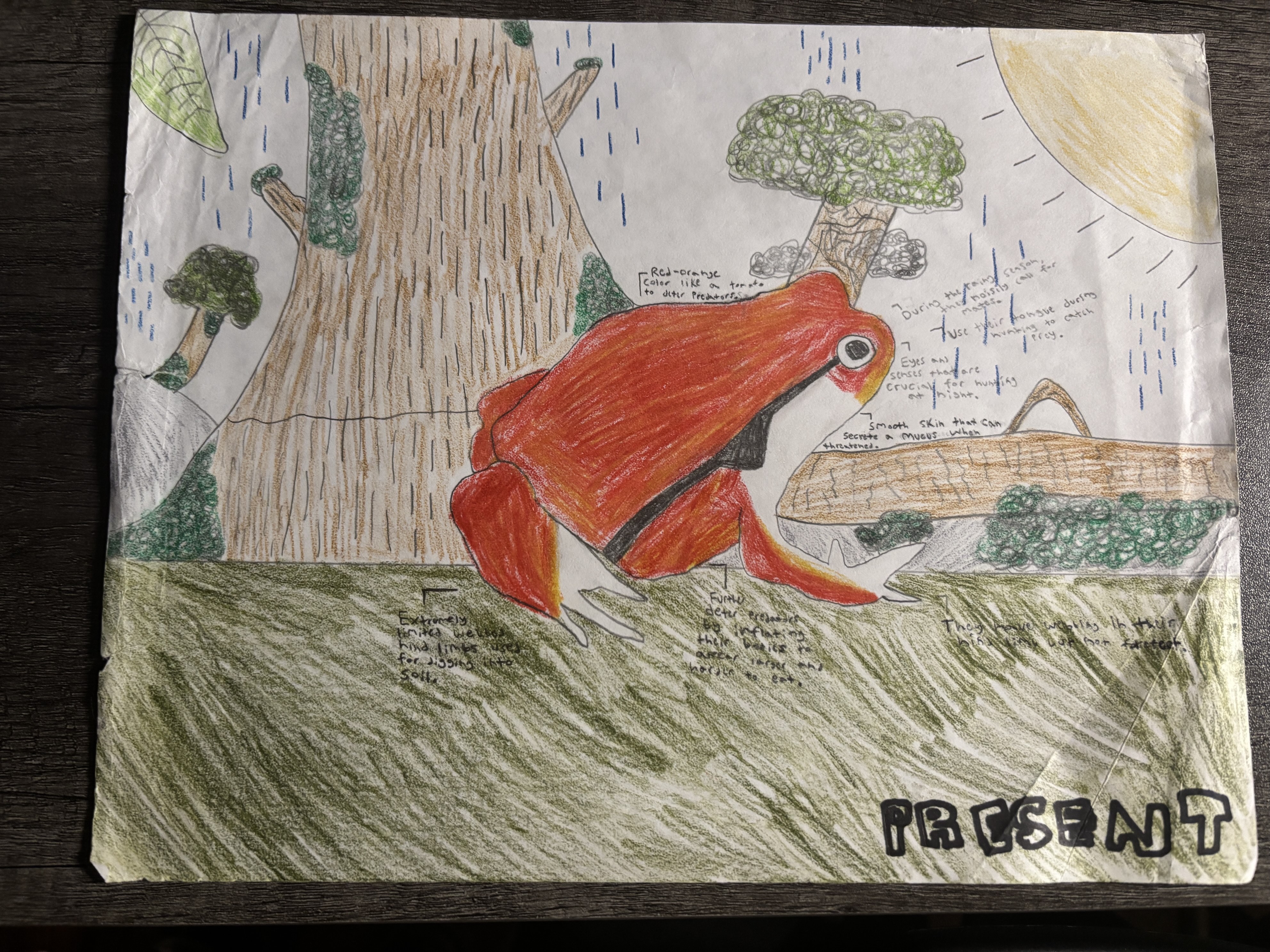 My creature, the Tomato Frog (TF), is native to Madagascar. They are commonly found along the eastern rainforest, and like to inhabit swamp regions, rainforests, and slow moving waterways and ponds. In the future, I predict that my creature’s habitat will change into a savannah because of many aspects such as global warming, greenhouse gases, and unregulated artificial intelligence. The rainforest would slowly lose its tropical and humid climate, and turn into a new biome with wet and dry seasons and grasses with scattered trees. I also predict that the Tomato Frog will have new and modified adaptations like being able to launch a toxin by puffing out its skin and then deflating quickly, and having sticky limbs to latch onto trees and such. I predict this because its current rainforest habitat is humid, but the savannah has changing climates which the TF will have to adjust to with adaptations.